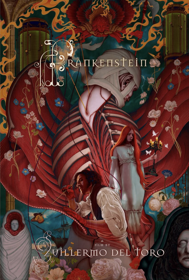 Curiosidade: A impressão de edição especial do pôster inclui relevo detalhado, aplicações metalizadas e acabamento brilhante. O artista James Jean explica que cada fibra muscular delicada ganha vida sob a luz que muda. A impressão de Frankenstein foi assinada e numerada e ficou à venda por 24 horas, sendo uma edição limitada. A arte é tão especial pois o ilustrador quis corresponder ao que Del Toro disse a ele: que esse filme é o ápice de tudo que ele queria alcançar.